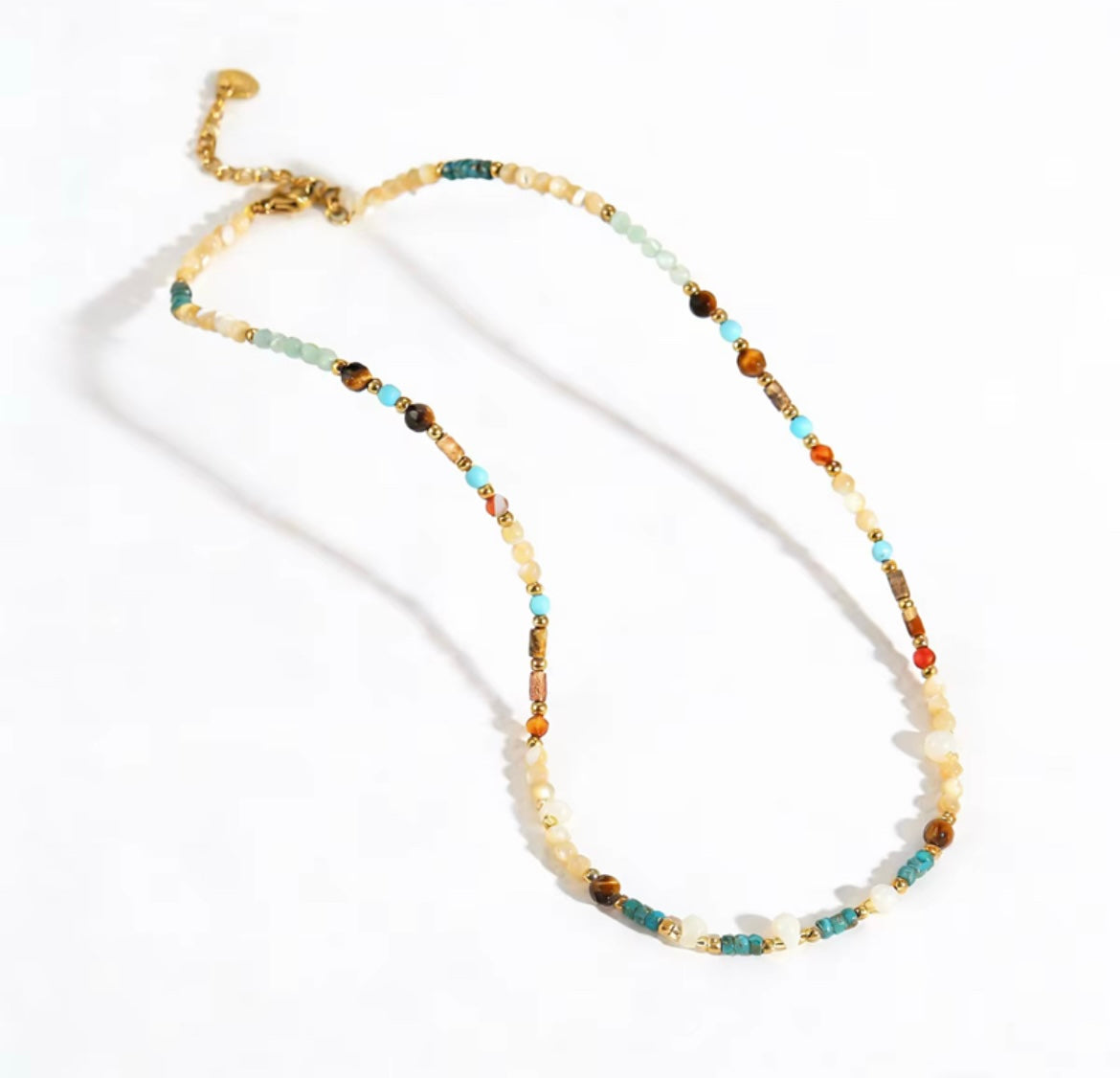 A delicate beaded necklace inspired by smooth stones shaped by sea and sun. Hand-strung with soft neutral gemstones, gentle ocean blues, and warm earthy accents, this piece feels calm, balanced, and effortlessly timeless.