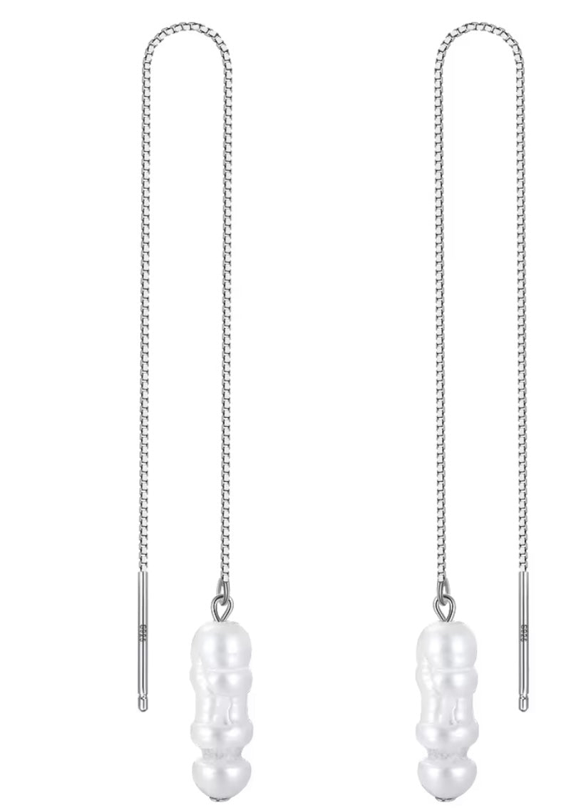 Our Coastal Threader Pearls feature a sleek sterling silver threader chain with a soft freshwater pearl drop. Designed to move beautifully with you, these earrings offer an effortless, modern look with a touch of seaside elegance. Wear them long or adjust for layered styling.