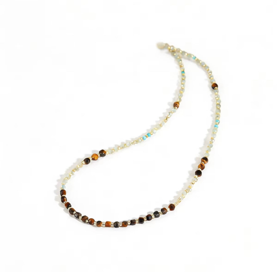 A delicate beaded necklace inspired by sunlit shores and soft coastal mornings. Hand-strung with warm amber-toned gemstones, subtle pearl-like beads, and gentle turquoise accents, this piece feels calm, balanced, and effortlessly elegant.