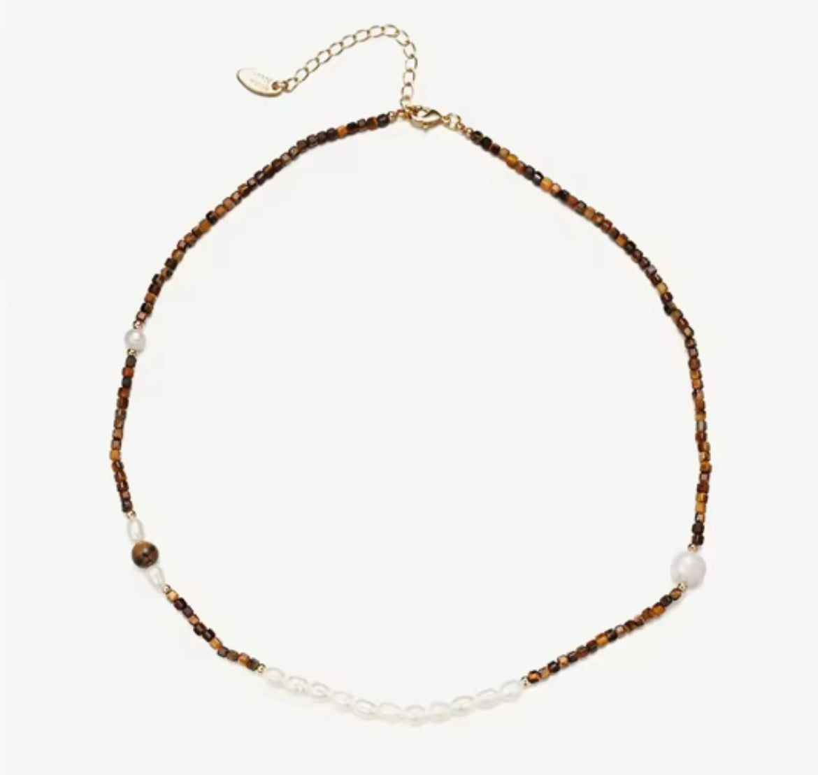 A delicate beaded necklace inspired by warm earth tones and soft natural textures. Hand-strung with rich amber hues, subtle neutrals, and freshwater pearls, this piece feels balanced, understated, and effortlessly elegant.