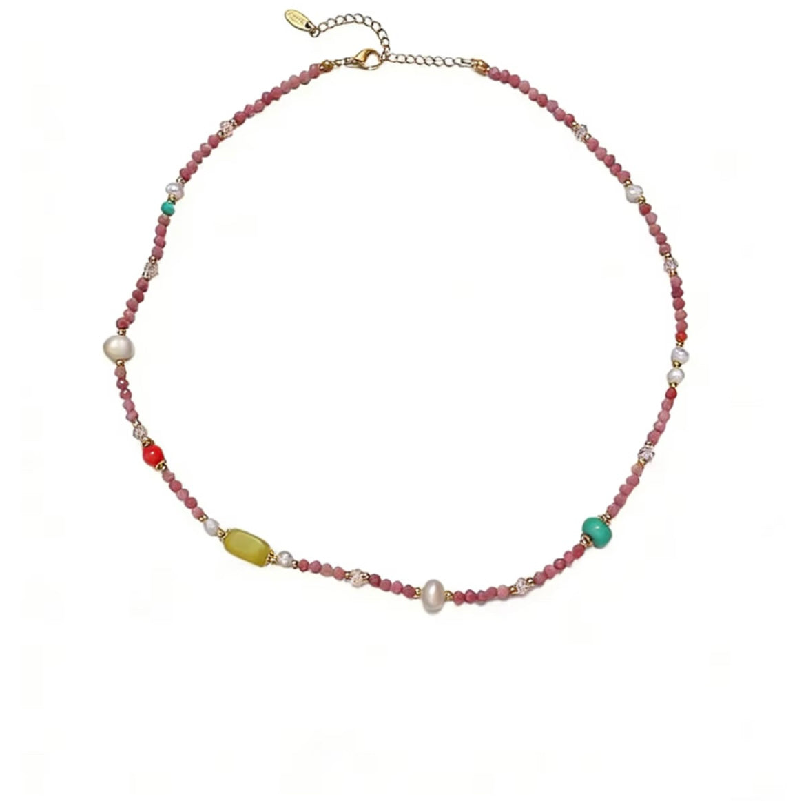 A delicate beaded necklace inspired by soft tides and sun-faded horizons. Hand-strung with blush-toned gemstones, subtle neutrals, and gentle pops of sea-green and coral, this piece feels light, romantic, and effortlessly wearable.