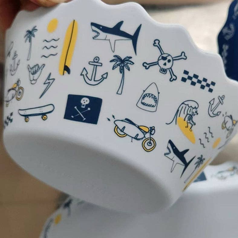 * Rad Times silicone kids dinnerware with hand illustrations.