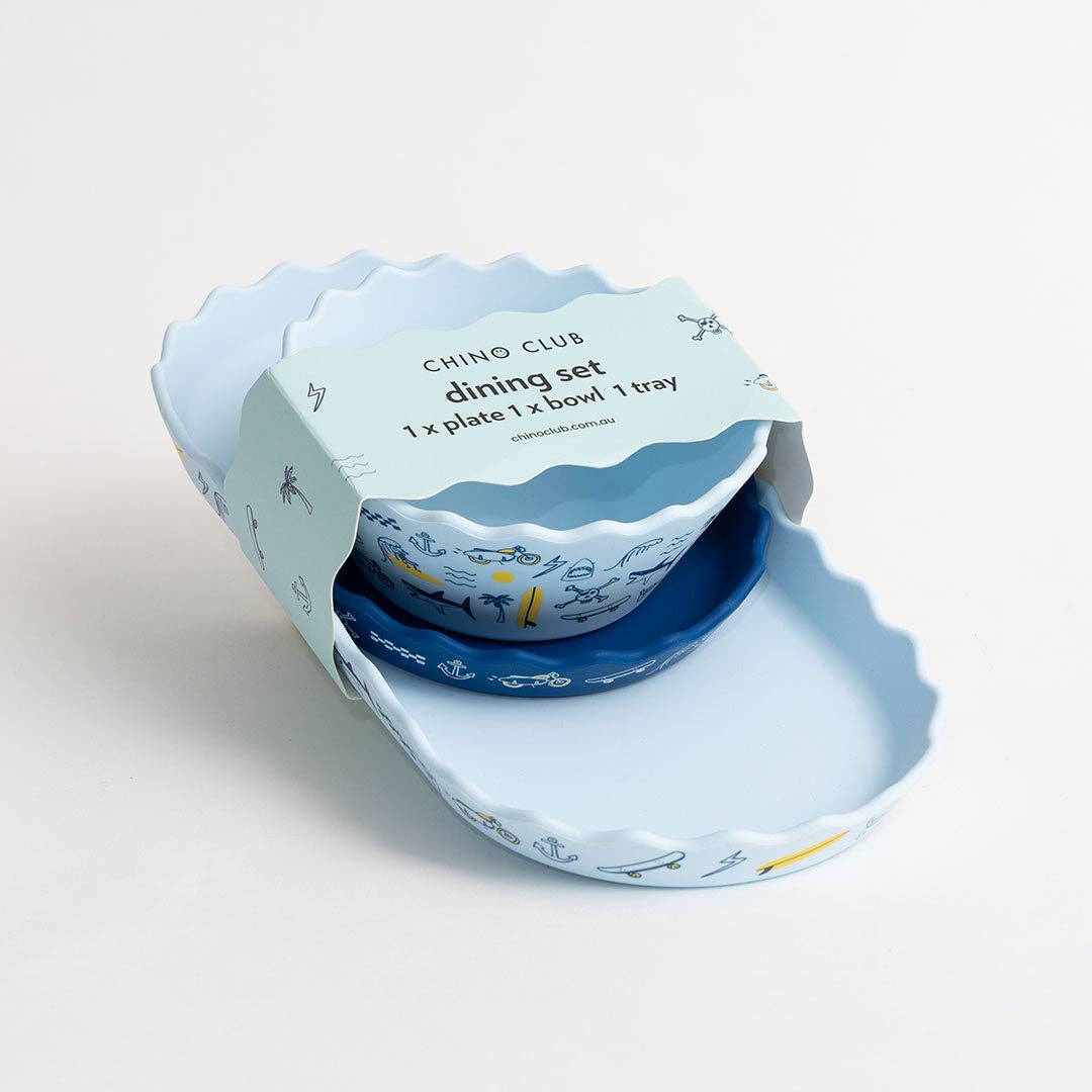 Introducing the raddest three piece kids dinnerware set you ever did see - Rad Times print for the cool kids, complete with on-trend wavy edges.