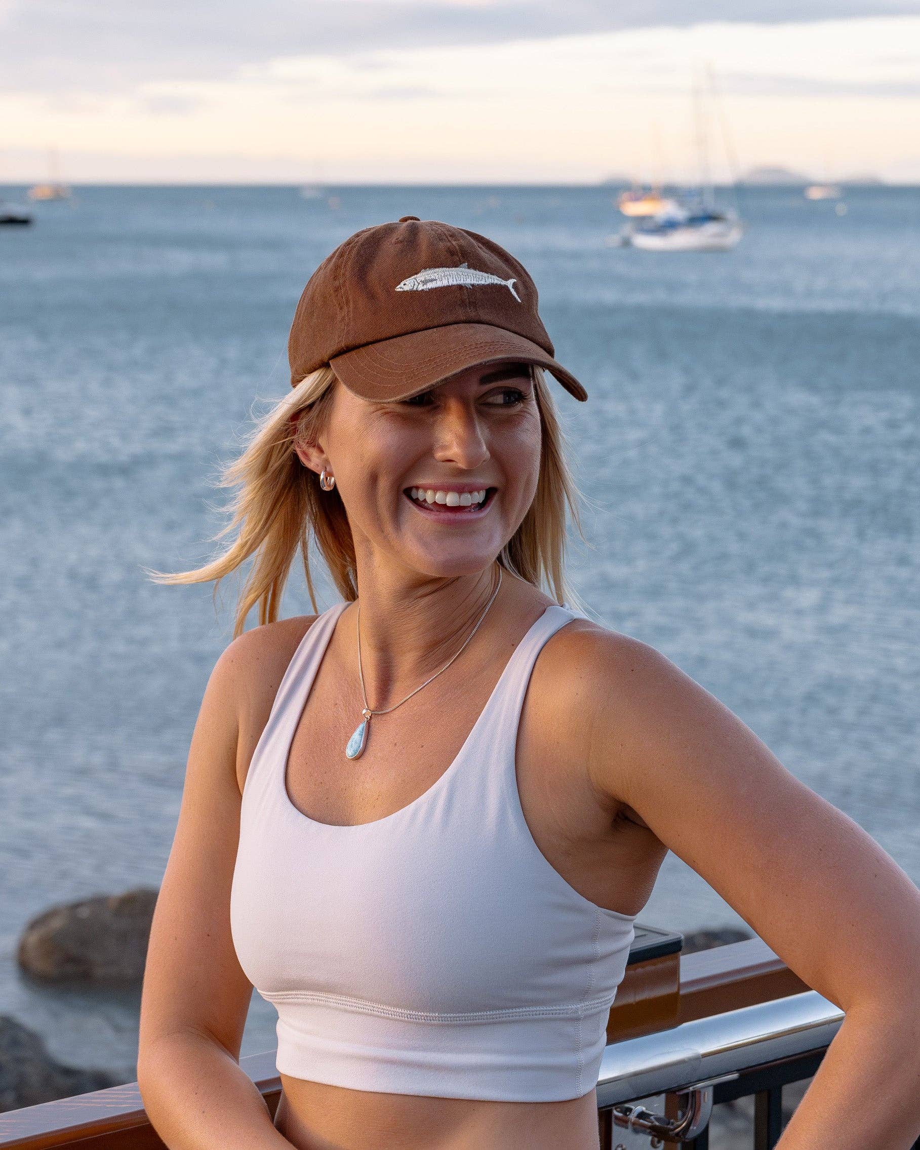 The Spanish Mackerel Lid is a classic dad cap style with a chocolate brown colour-way. It features one of northern Australia's most iconic predatory fish. You may have seen them in the water, shimmering on the edge of a drop off, and you've most definitely seen them on the board of a fish & chips shop. This lightweight cotton hat pairs perfectly with any outfit, and is designed to fade and soften into an old favourite.
